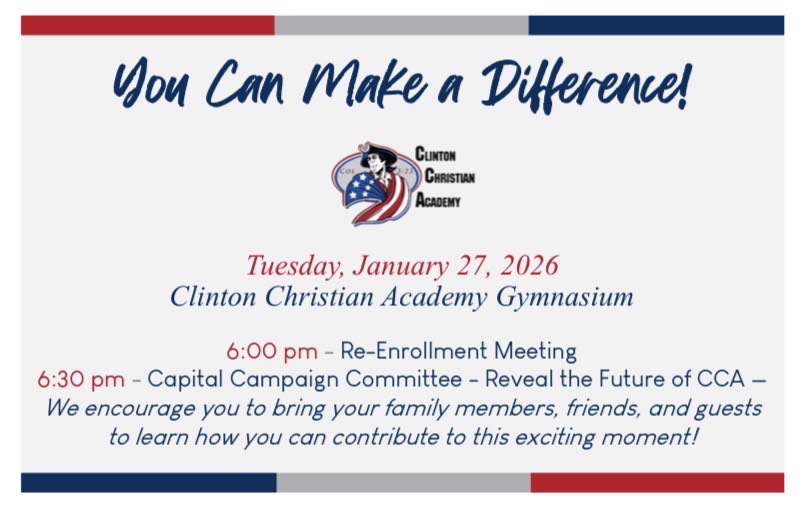 Thank you for visiting Clinton Christian Academy. At CCA, students, along with the investment of parents, teachers, staff, and the board of education, strive for excellence in Christian Principles, Christ Centered Academics and American Patriotism.